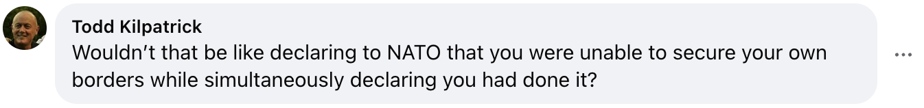 还有网友质疑称,“这岂不是相当于向北约宣告,你无法保障本国边境安全,但同时又声称自己已经做到了这一点吗?”↓